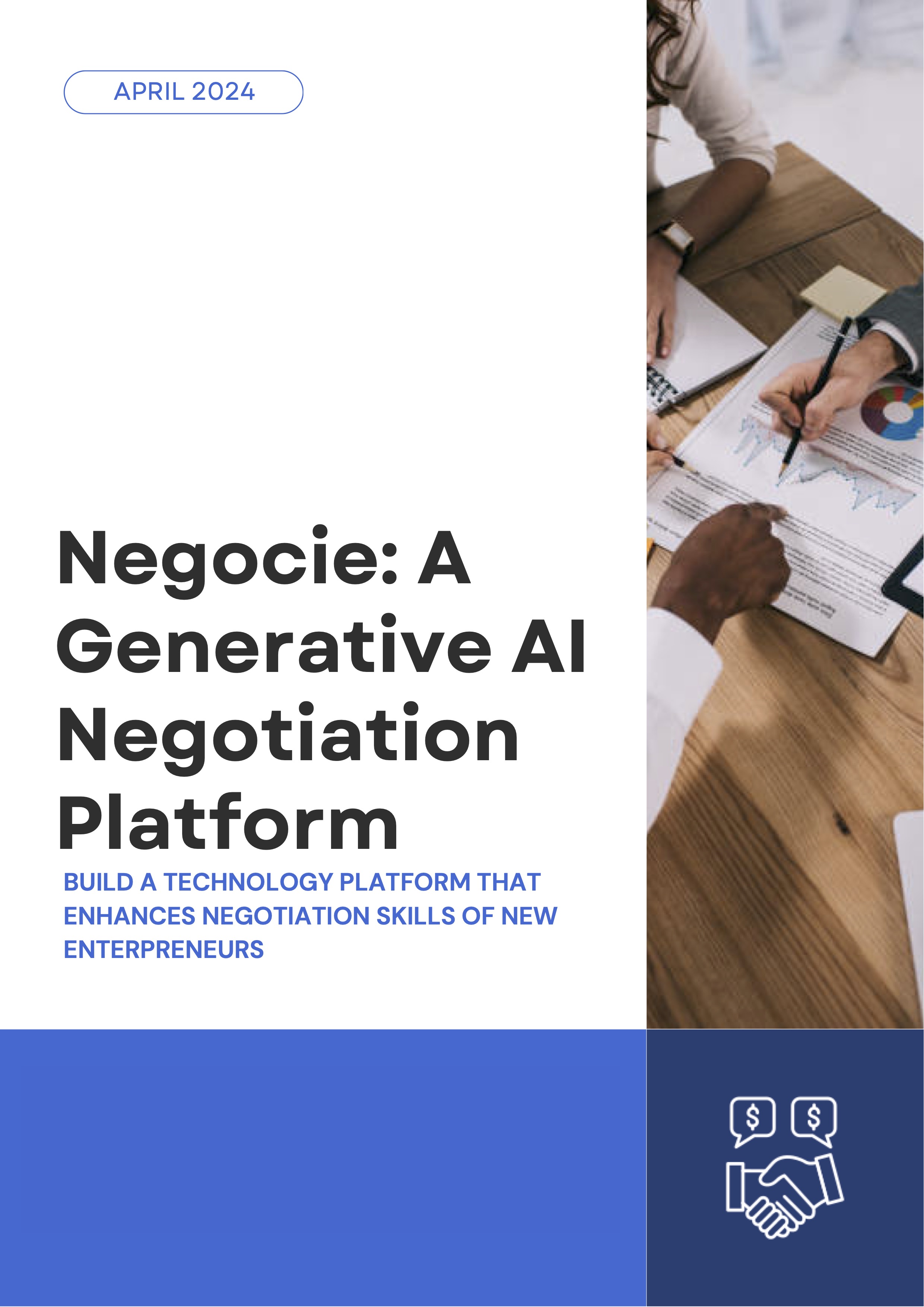 Negocie is an innovative online platform designed to enhance communication and negotiation skills among new entrepreneurs in the United States. Negocie provides online courses and negotiation practice. The course curriculum includes scenarios of negotiation with investors, employees, and government regulators. The practice is in the form of conversations with a chatbot. The chatbot can play certain roles, and users can practice negotiation with the chatbot. Negocie delivers the content through both web and mobile applications. Moreover, Negocie forms personal advice and recommendations based on the user's personal chat history. This business document provides a discussion of needs assessment, pedagogy & curriculum, technology & platform, engagement & community, and the next phase.